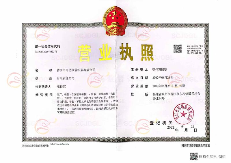 晋江市南星服装织造有限公司在2002年06月26日创建,公司总部创建于福建省泉州市晋江市东石镇潘径村公路北44号;经营领域为生产、销售(含互联网销售):服装、服装辅料(粘扣带)、包装带、化纤布、非医用日用防护口罩、非医用日用防护服、手套、货物或技术的进出口业务。。单位性质有限责任公司(自然人投资或控股),注册资本1000万人民币,