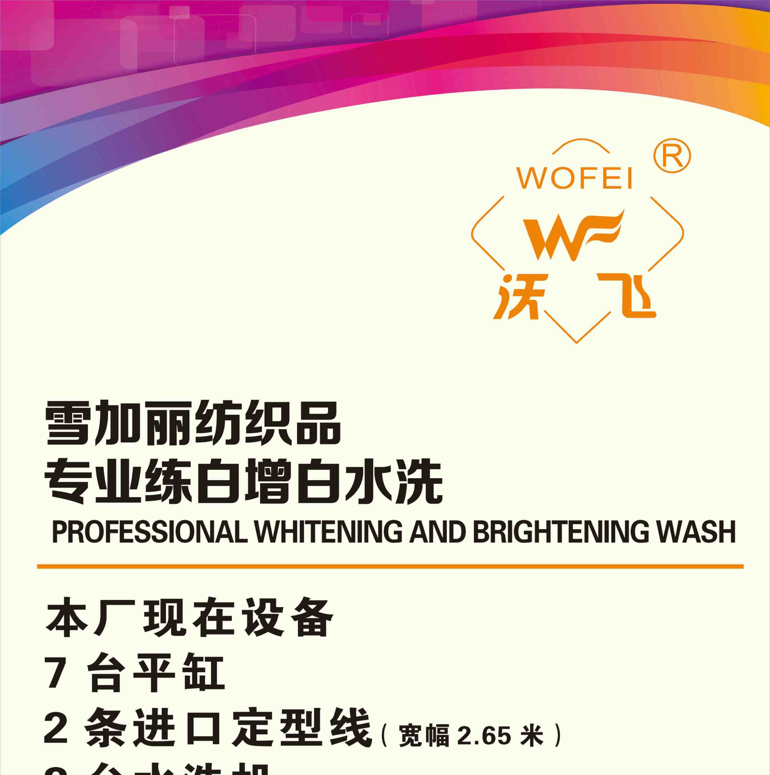 本厂现有设备:7 台平缸 2 条进口定型线(宽幅 2.65m)2 台水洗机 冷堆机及烘干机 成品日产量 30 万米 无氟专线和 grs 指标